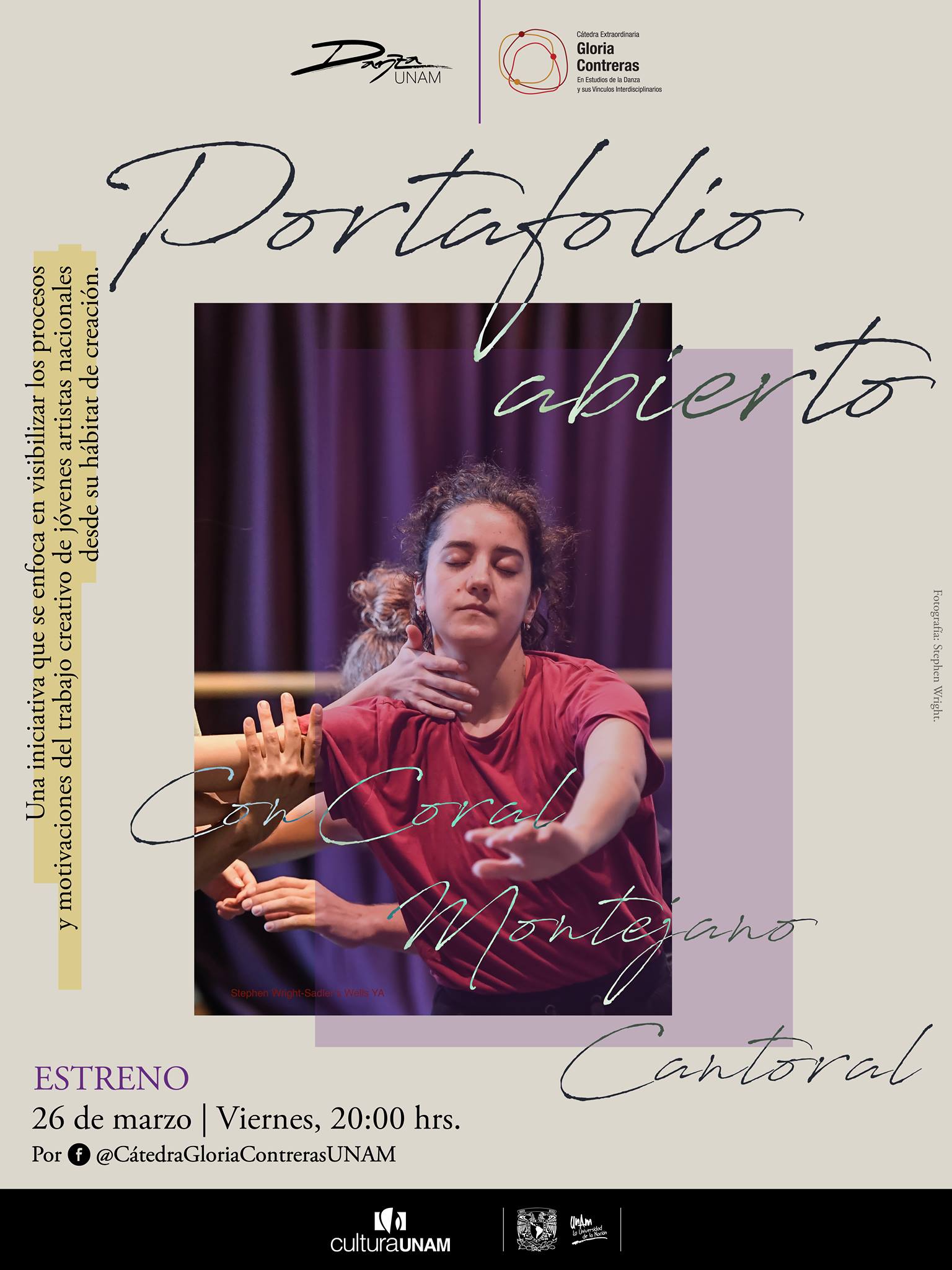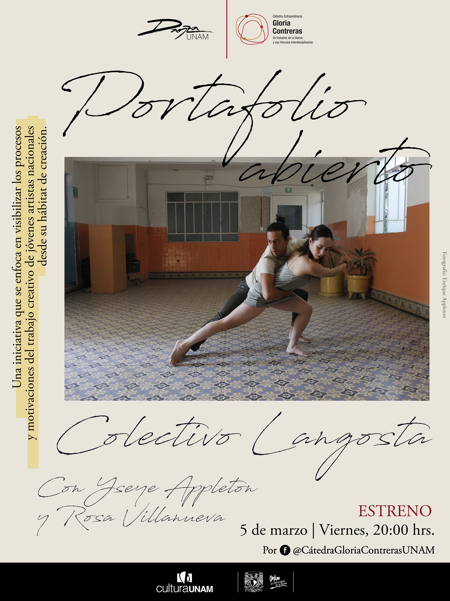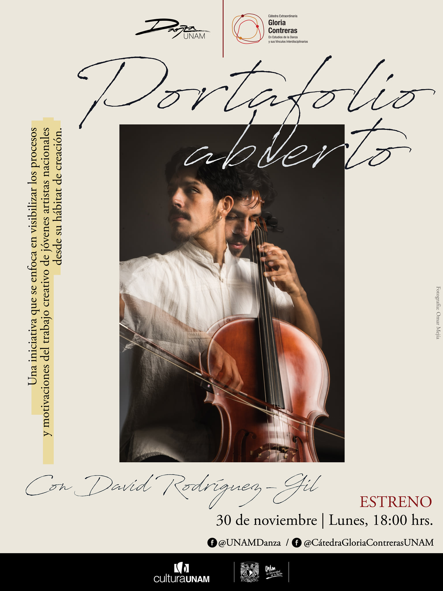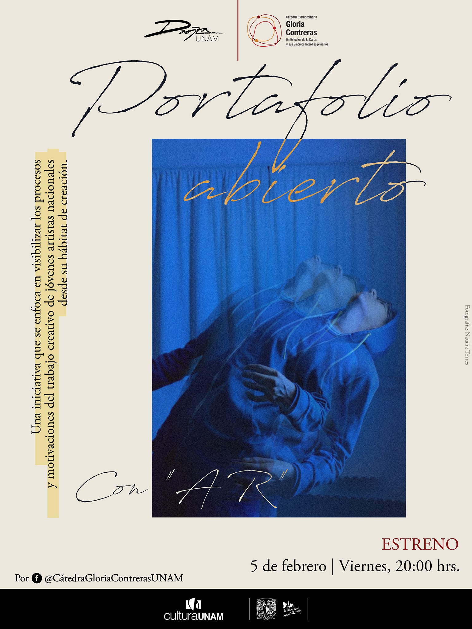 Open Portfolio (Portafolio Abierto) is a video-interview initiative by Víctor Hugo Loaiza in collaboration with The Extraordinary Chair Gloria Contreras of Danza UNAM to showcase the work of young artists involved in dance and the performing arts from their habitat of creation. The project conducted four interviews during its activity period from 2020-2021.